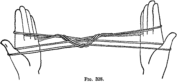Sixth: Transfer the thumb loops to the index fingers by putting each index from below into the thumb loop, and withdrawing the thumb and returning the index to its position (Fig. 329).
