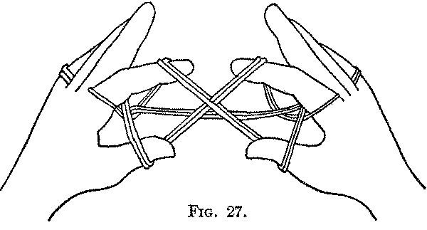 This figure was taught to me by Dr. Haddon in August, 1904. He obtained it when on the Cambridge Anthropological Expedition to Torres Straits; it is described by Rivers and Haddon (p. 150). In Mer (Murray Island), Torres Straits, it is called Ares = Murray and Dauar men fighting. One twisted loop of the finished figure represents the Murray man, who always carries off the Dauar man’s head.