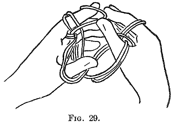 The Fighting Head-Hunters is a good example of that simple type of figure in which most of the movements consist in passing the fingers away from you and toward you, and taking up strings and loops from other fingers of the same hand. The picking up of the strings forming the sides of the central triangle is not a common movement. In the Second movement a loop is transferred from one finger to another and turned over during the transfer. In the Sixth movement we have the first example of an almost universal procedure: When two loops are on a finger the lower loop is lifted over the upper loop and off the finger to form, toward the centre of the figure, a running noose or ring upon the upper loop. If there be three loops on a finger the lower one may be lifted over the upper two, or the lower two over the upper one, but in all cases the principle is the same, namely, to thread the upper loop, which originally belonged to another finger, through the lower loop, which is usually the original loop of the finger. As we shall see further on, this movement is executed in different ways: with the teeth, with the thumb and index of the other hand, by the aid of another finger of the same hand, or merely by twisting the finger itself. It is so general in the Navaho Indian figures that, following Dr. Haddon, in conversation we often speak of it as the "Navaho movement," or, coining a new verb, direct that the loops on a finger shall be "Navahoed."