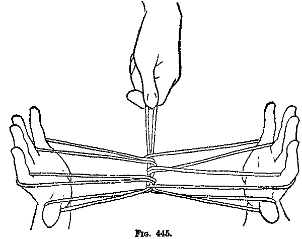 In Torres Straits this figure is formed by one person. After Opening A, the four fingers of each hand are passed from above into the thumb loop and closed over all the strings except the near thumb string, to hold them tight. The hands are then turned with the fingers directed away from the body and the toe is passed up and put from the far side into the thumb loop to catch the near thumb string and pull it down.