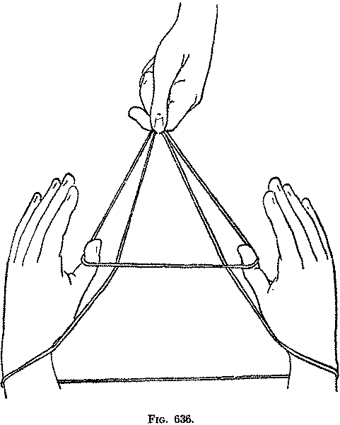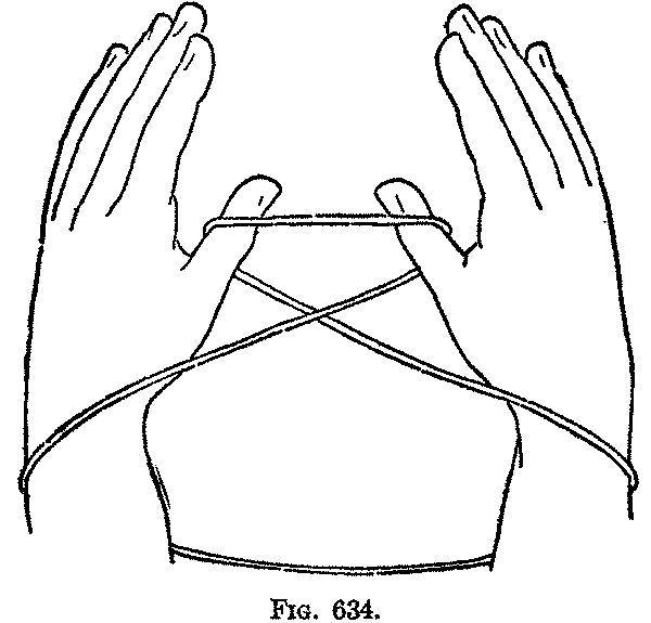 So far as I know, this figure is the first African string game that has ever been described. The nature of the Batwas and their isolation in the heart of Africa would not lead us to expect to find among them a relatively complicated figure, and make any resemblances which this figure may bear to other figures doubly interesting. We see at a glance that it has much in common with the "Caroline Islands Diamonds" and the "Turtle." The finished pattern is identical with the pattern formed after the Sixth movement of the Eskimo "Mouth"; hence you can go on and finish the "Mouth" from the finished pattern of the "Pygmy Diamonds." This is the only case, in my experience, where the finished pattern of one figure occurs as a stage in the development of another entirely different figure.
