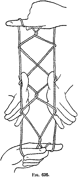 Second: The first person now puts his right thumb from below into the left thumb loops of the second person, and his left thumb from below into the left little finger loops of the second person, and takes these loops away from the second person on his thumbs. The second person puts his left thumb from below into the loops which are on his right thumb, and removes the right thumb, and puts his right thumb from below into the loops which are on his right little finger, and removes the right little finger. The figure is now drawn tight on the four thumbs (Fig. 628). It consists of a central lozenge, the sides of which form the bases of the triangles held by the thumbs.
